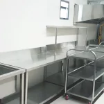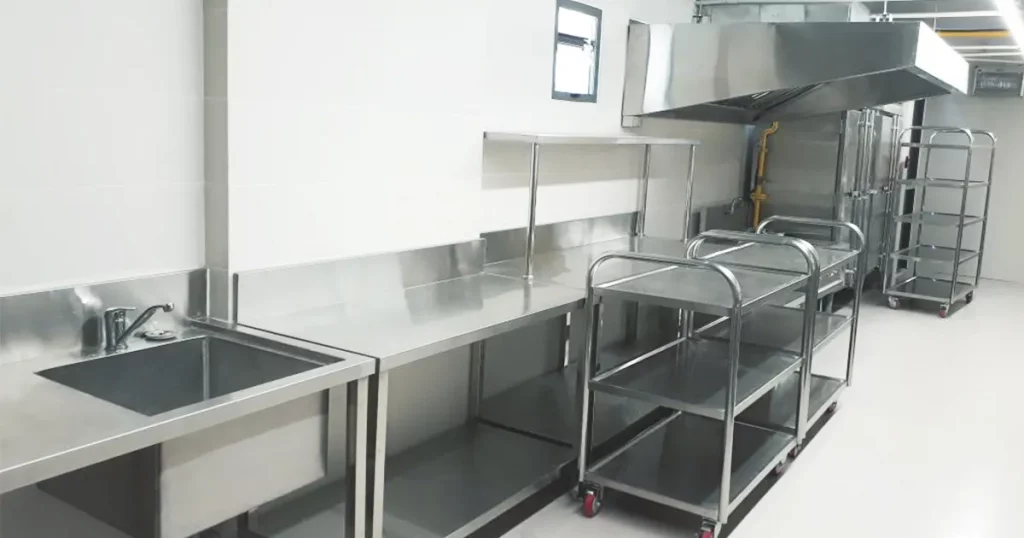 Các thiết bị bếp và vật liệu bề mặt phải đảm bảo an toàn vệ sinh thực phẩm. Inox là chất liệu phổ biến nhất do khả năng chống gỉ, dễ lau chùi và chịu nhiệt tốt.