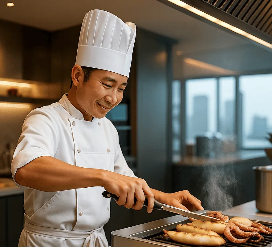 “Than nhân tạo giữ nhiệt rất ổn định. Khi nướng, chỉ cần trở tay liên tục thì mực sẽ không bao giờ bị khét hay cứng. Nướng nhanh – ăn liền, đó là nguyên tắc giúp giữ trọn hương vị tự nhiên.”