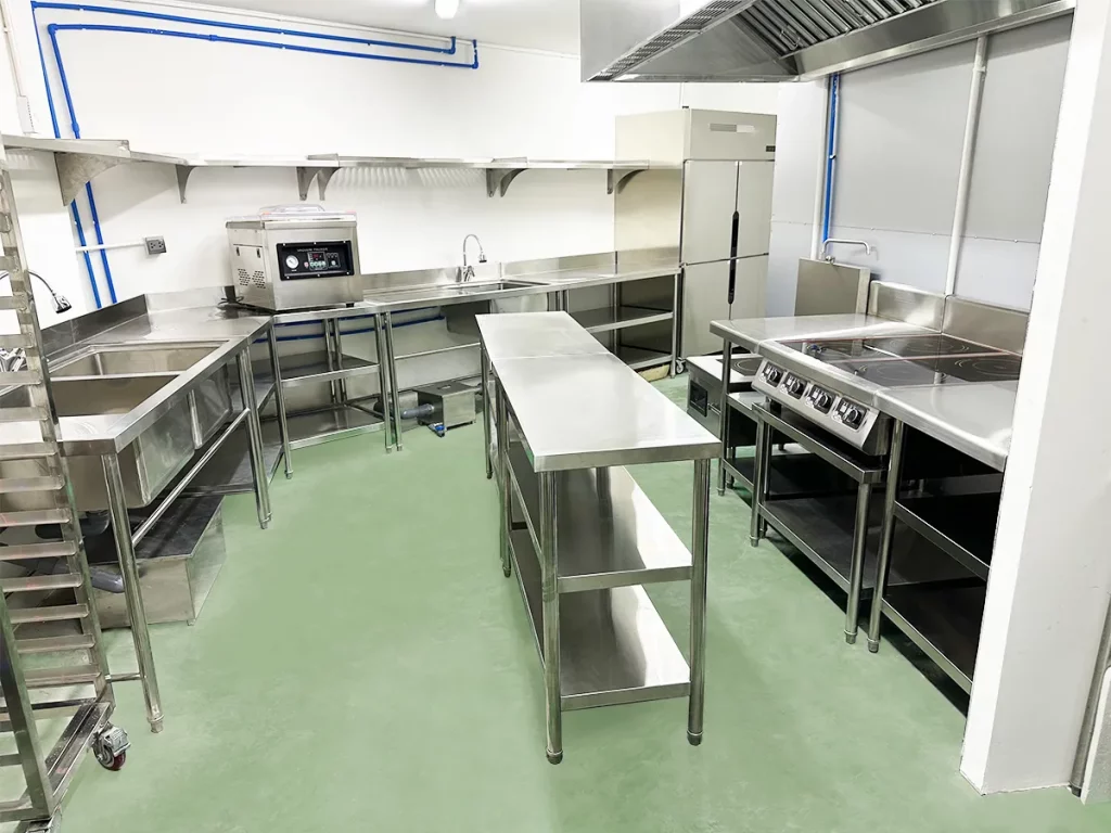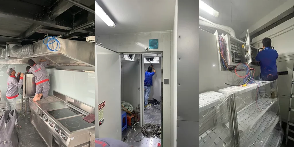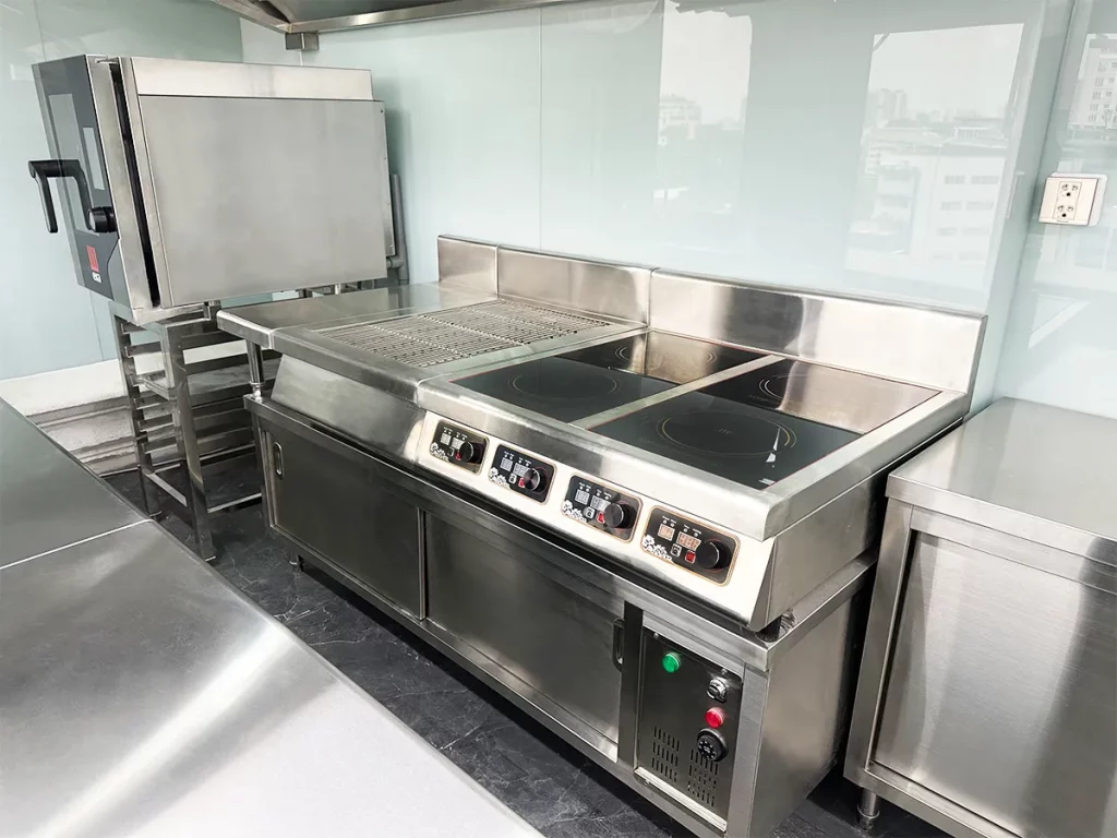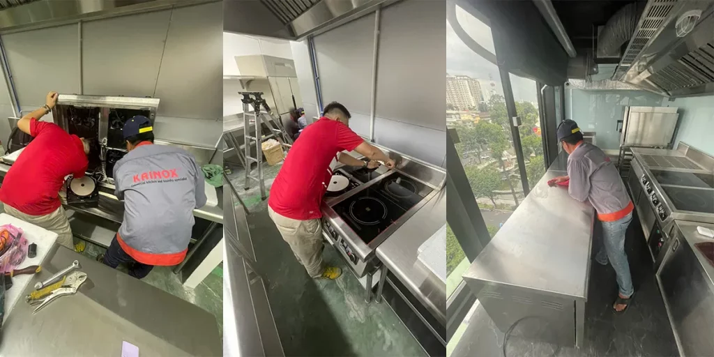 KAINOX trực tiếp cung ứng và lắp đặt hệ thống thiết bị bếp công nghiệp cao cấp, bao gồm: bếp từ, bếp âu, lò nướng đa năng, hệ thống hút khói – hút mùi công suất lớn, tủ lạnh công nghiệp, và hệ thống chiếu sáng tiết kiệm điện.