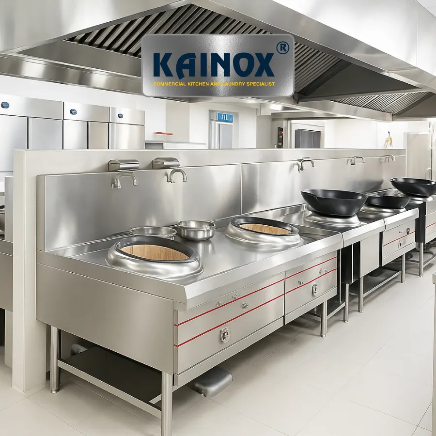 – KAINOX thiết kế toàn bộ khu bếp nấu – sơ chế – hấp – ra món – khu rửa, kèm hệ thống hút khói – cấp khí tươi – xử lý mùi.