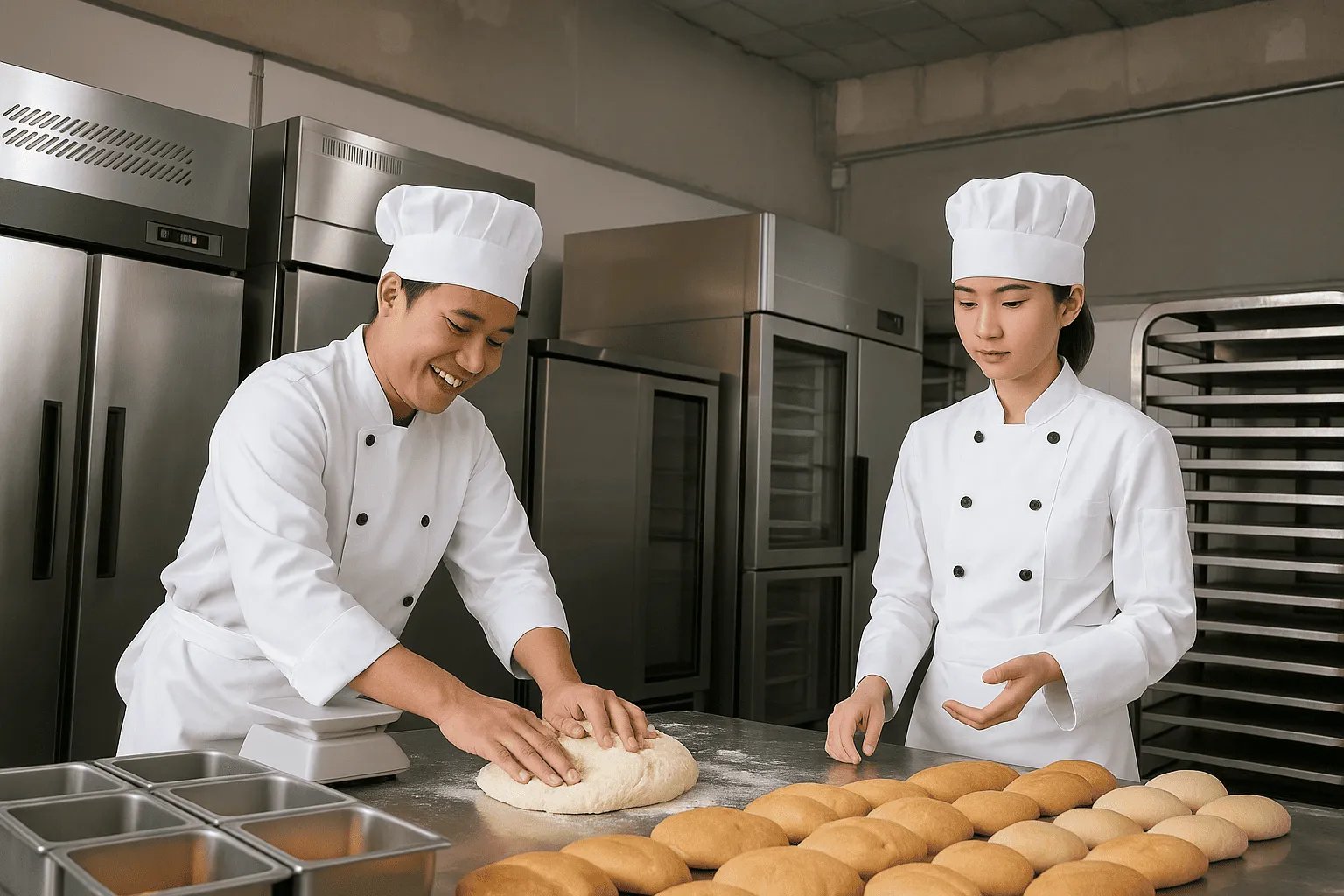 Chúng là những nhân tố chủ động trong toàn bộ quy trình làm bánh – từ lúc bột được đong đo, trộn nhuyễn, ủ phồng, đến khi từng ổ bánh được đưa vào lò nướng và cắt chia đều đặn.