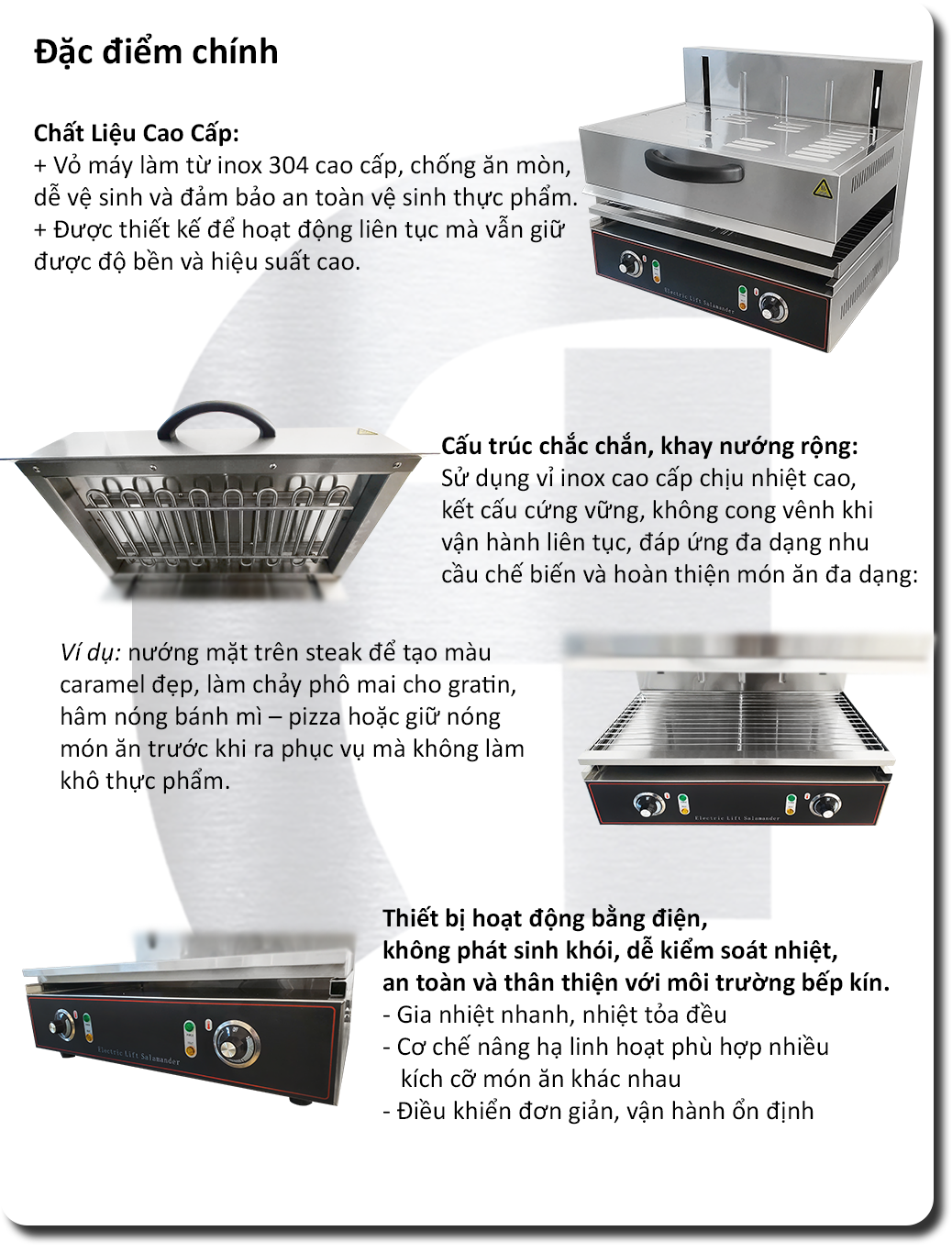 Salamander điện là thiết bị chuyên dùng để nướng mặt trên, làm chảy phô mai, gratin, tạo màu vàng đẹp và giữ nóng món ăn trước khi phục vụ.